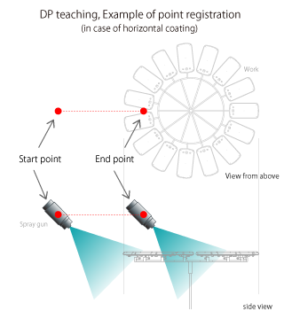 - In case of revolving coating with horizontal placement, coating gun speed and other conditions should be adjusted because of peripheral difference between inner and outer. In this software, only input of 2 points of Start and End points will automatically make an appropriate coating data with suitable coating speed between the two points.