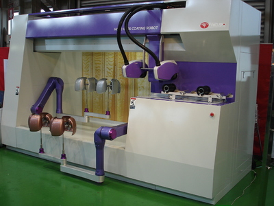 ドアミラーカバー4個を円形治具に取り付けロボットが回転塗装するもの。従来のロボットとは仕様が異なり、回転機構をもつ搬送部もロボット化。天吊りロボットは、2軸限定。特に大きな違いは、エアホース以外の、塗料ホースが一切無いと言うこと。