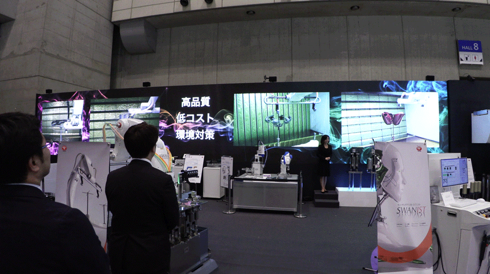 東芝機械(株)殿による自動脱着システム(左)と大画面プレゼンテーション(右)