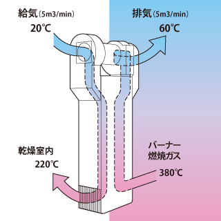 燃焼した排気熱と炉内へ給気する空気へ約85%の熱交換率で熱交換します。必要な熱燃焼エネルギーで、昇温させるため無駄なエネルギーを使うことなく乾燥可能になります。また、炉内へは常に新鮮で豊富な酸素を給気され、塗料の蒸発ガスが充満することなく乾燥ができ、ガスチェッキングなどの塗装不良をお防止しています。特に白物などの黄変不良予防に効果を発揮します。